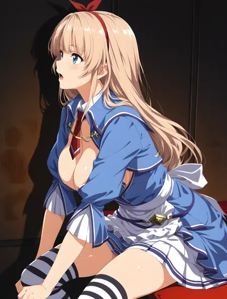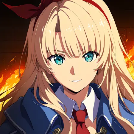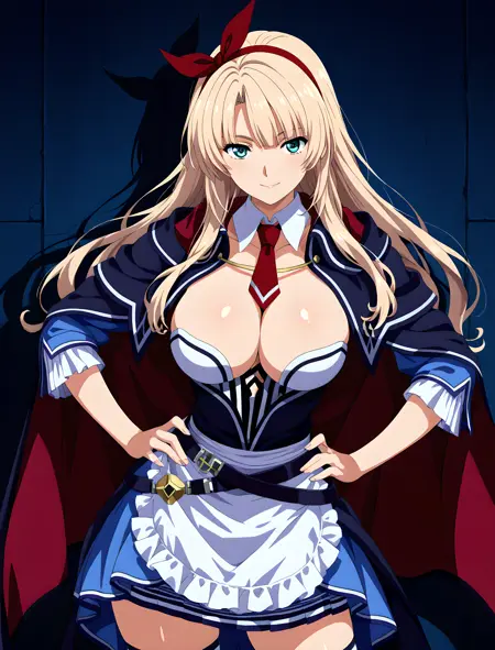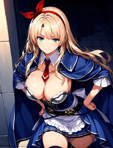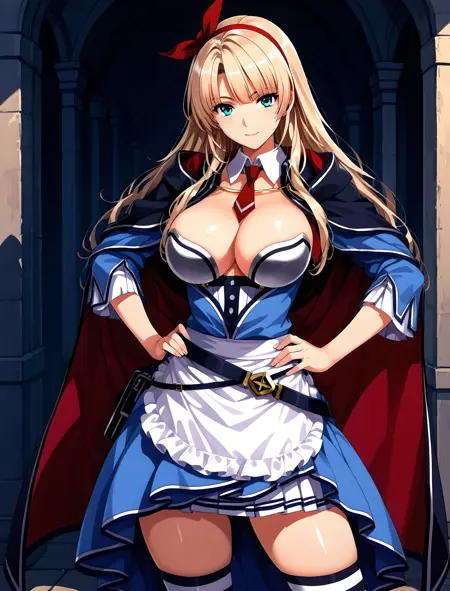 activation tag is "alicia(qbg),", appearance tag is "blonde hair, long hair, large breasts, green eyes,", outfit tag is "striped thighhigh, long hair, cleavage, red hairband, red necktie, blue cape," and alternatively, "blue eyes" color. "anime coloring" tag is also possible.
