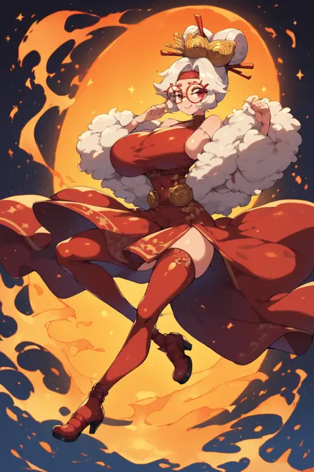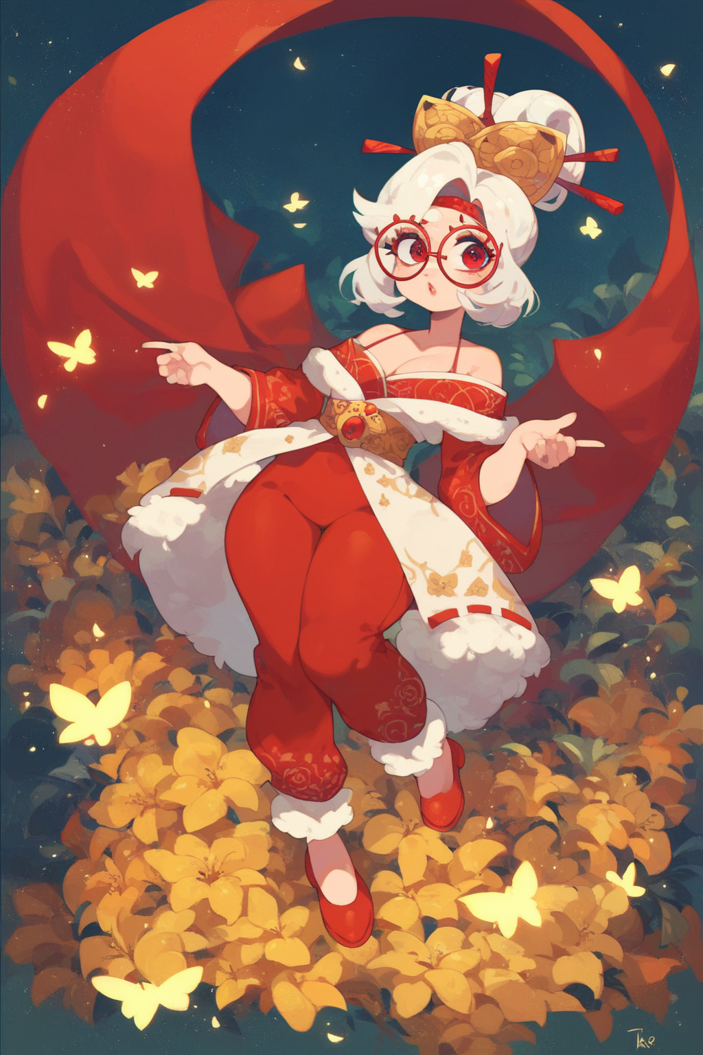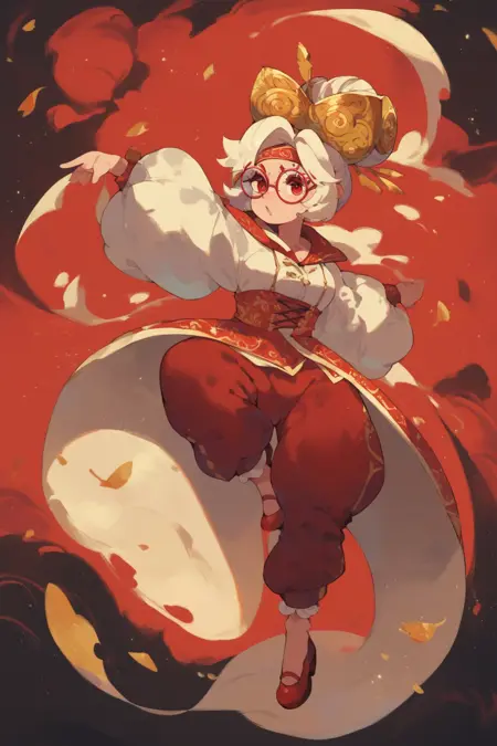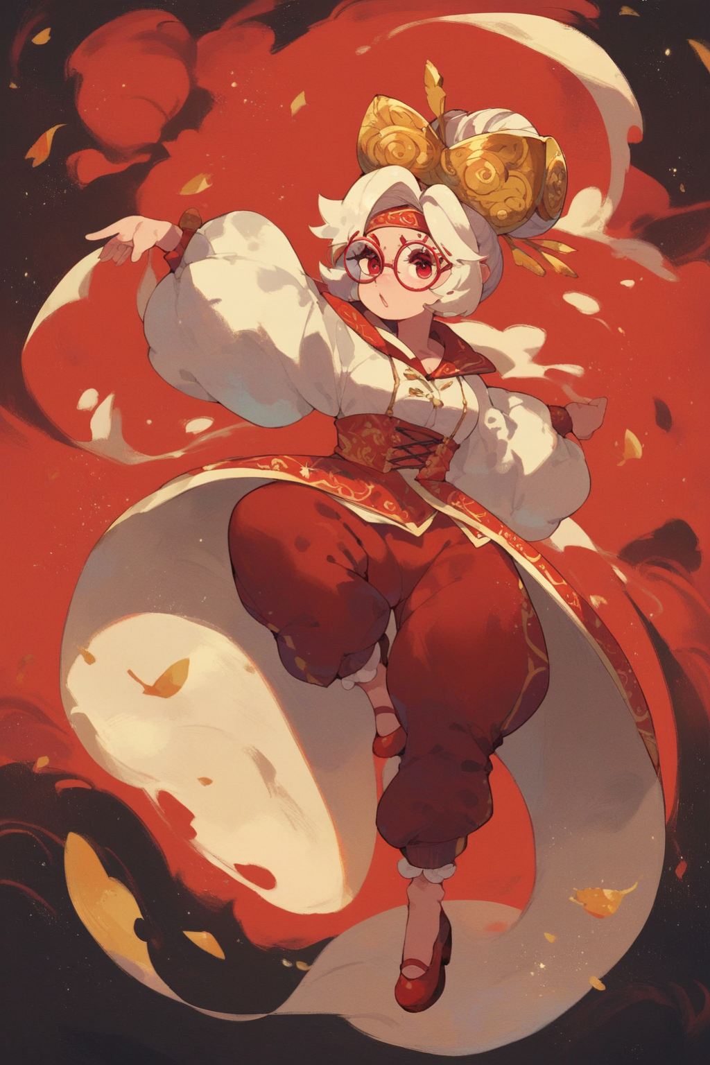 Prompts: Purah_TOK, white hair, red eyes, yellow hair ornament, red glasses, hair bun 1girl, red-framed eyewear, round eyewear