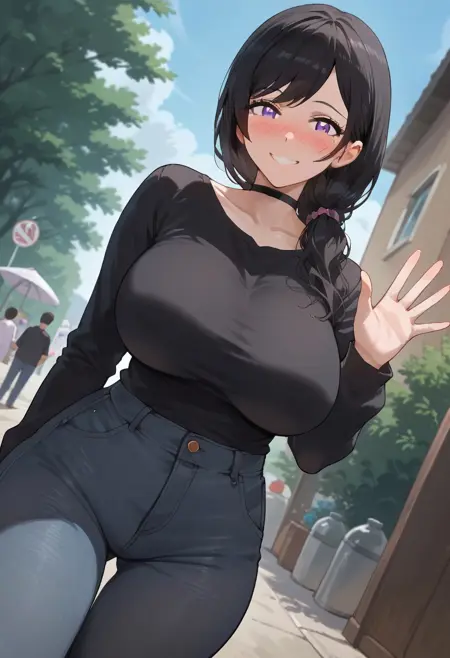 Activation: (Tacizumi), black hair, hair tied over shoulder, hair tie, mole under 1 eye, mature woman