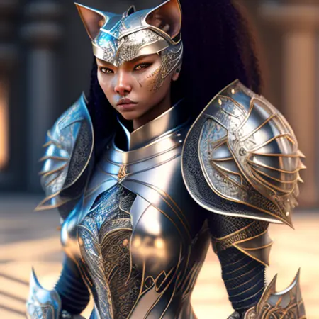 プロンプト:ひざまずく猫の騎士、ポートレート、細部まで精巧な鎧、複雑なデザイン、銀色、絹、映画的な照明、4k