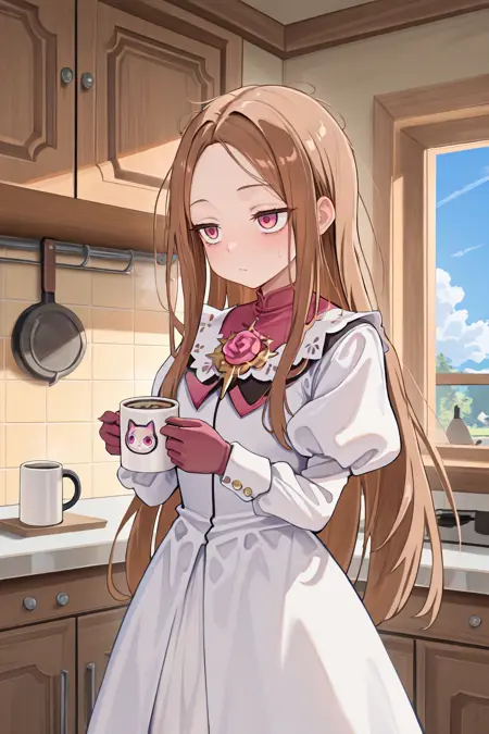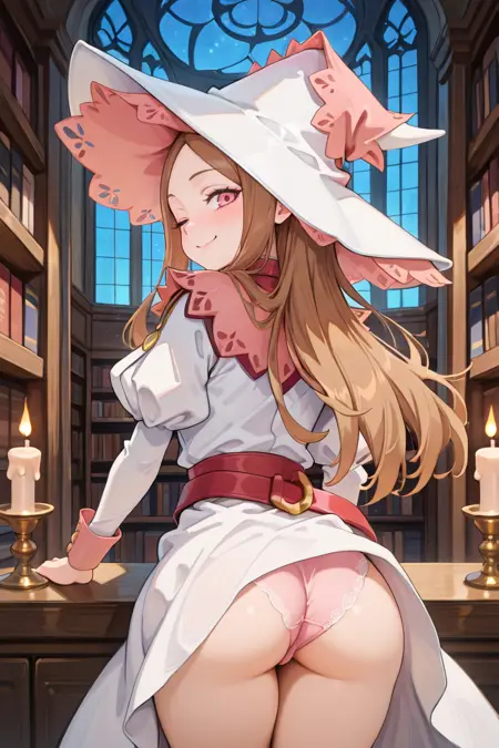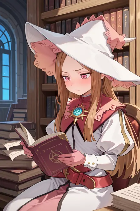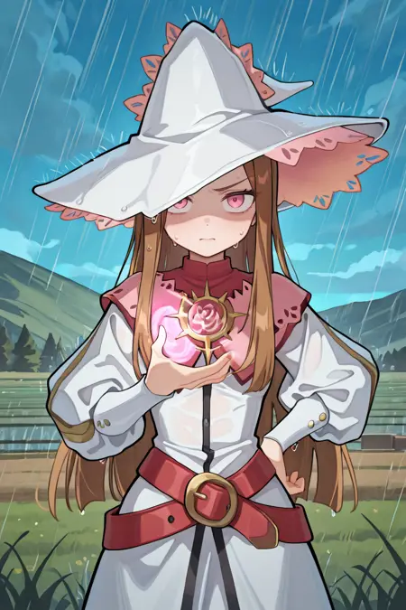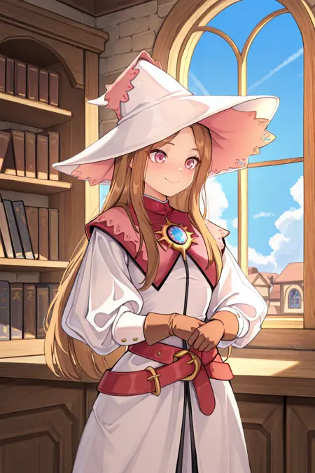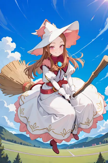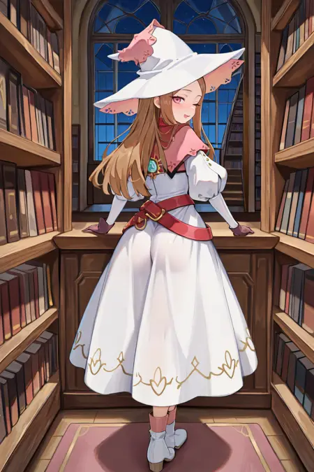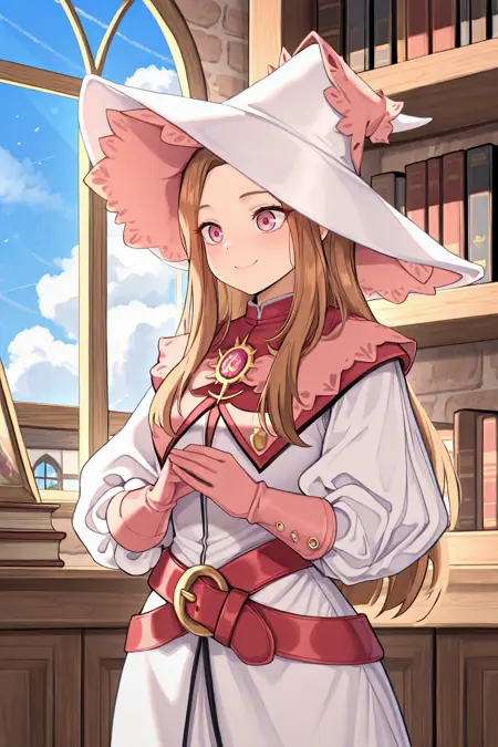 유용한 태그: 갈색 머리카락, 긴 머리카락, 빨간 눈, 흰색 마법사 모자, 흰색 드레스, 빨간 벨트, 줄리엣 소매, 흰색 부츠