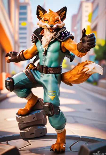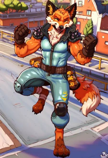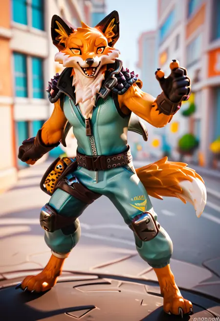 Pony: score_9, score_8_up, score_7_up, high quality, hi res, fennix, fortnite, furry, 1boy, solo, gloves, belt, yellow eyes, ...your tags...