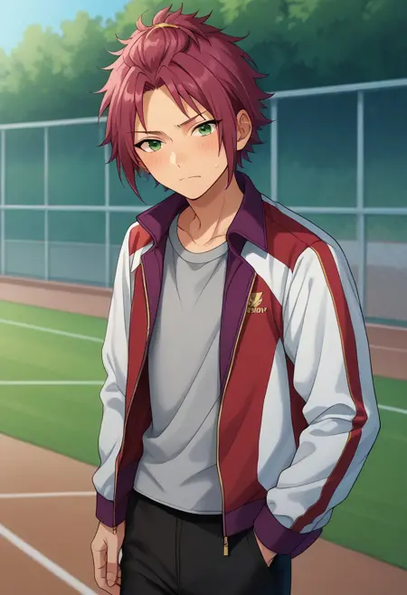 maoisara, 1boy, 男性聚焦, 绿眼, 单人, 夹克, 灰色衬衫, 裤子, 开襟夹克, 衬衫, 紫发, 开放式着装, 红色夹克, 刘海向后别起, 训练服, 运动套装, 运动夹克,