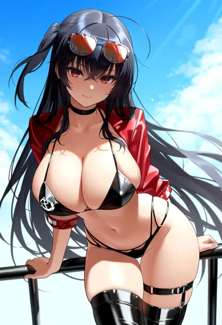 沉醉的伴侣(赛车女王):MLTaiRQ,黑色比基尼,黑色项圈,深沟,高腰比基尼,巨乳,多带式比基尼下装,一侧开叉,赛车女王,大腿绑带,黑色过膝靴,墨镜,红色夹克,黑发,红眼
