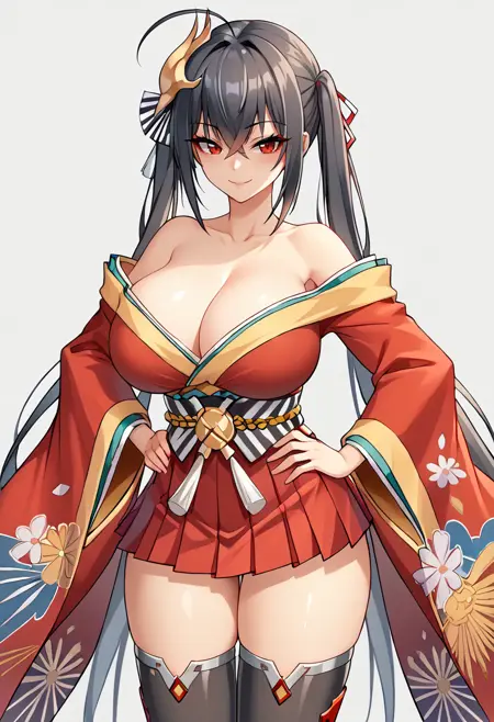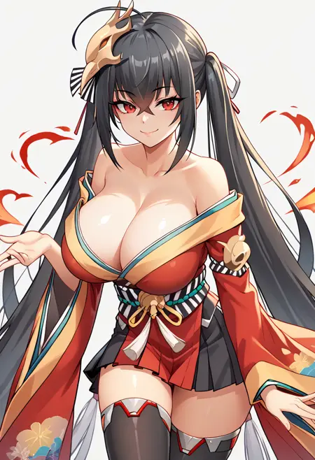 Base Skin: MLTaib, off shoulder kimono, short kimono, twintails, zettai ryouiki, wide sleeves, black thighhighs, hakama short skirt, red kimono , simple background, red eyes, crossed bangs , seductive smile, laced fingers, black hair, red eyes, hair ornament, huge breasts, cleavage,