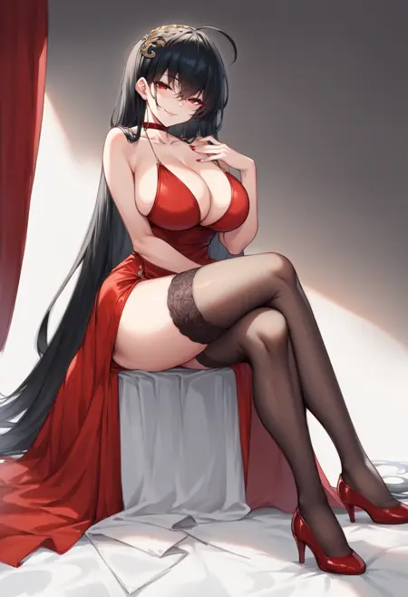 금지된 과일 (빨간 파티 드레스): mltaidress, 어깨 드러남, 검은 허벅지 스타킹, 목걸이, 흉부 노출, 클라비컬, 빨간 목걸이, 빨간 드레스, 머리 장식, 검은 머리, 빨간 눈, 거대한 가슴, 홀터 드레스