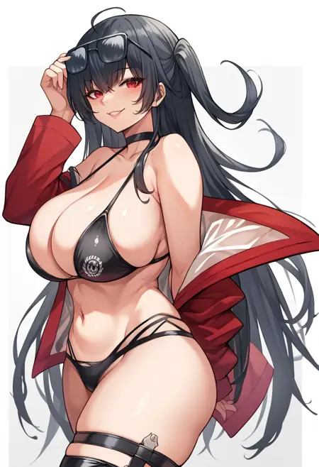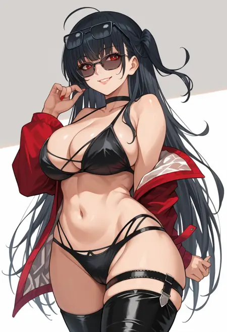 매혹적인 동반자 (레이스 퀸): MLTaiRQ, 검은 비키니, 검은 초커, 흉부 노출, 하이레그 비키니, 거대한 가슴, 멀티스트랩 비키니 하의, 한쪽만 위로, 레이스 퀸, 허벅지 스트랩, 검은 허벅지 부츠, 선글라스, 빨간 재킷, 검은 머리, 빨간 눈