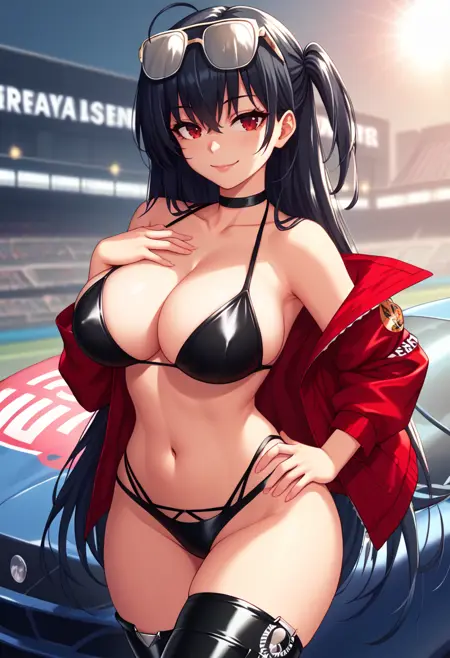 Enraptured Companion (Race Queen): MLTaiRQ, black bikini, black choker, cleavage, highleg bikini, huge breasts, multi-strapped bikini bottom, one side up, race queen, thigh strap, black thighboots, sunglasses, red jacket Black hair, red eyes,