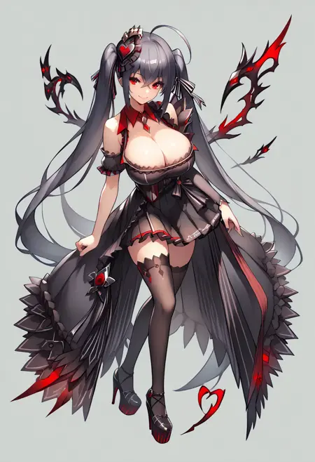 Taihou μ (Idol) - mltaidol, black idol dress, frills, black thigh highs, high heels, hair ornament, hair ribbon, red trim, (short skirt), simple background, bare shoulders, twintails, (short dress), asymmetrical sleeves