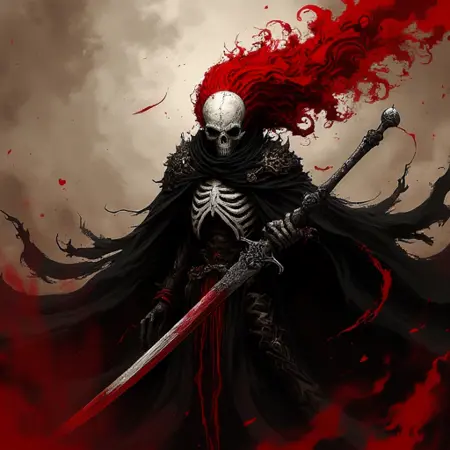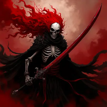 AssassinKahb style a demonic looking skeleton holding a sword with red hair 001