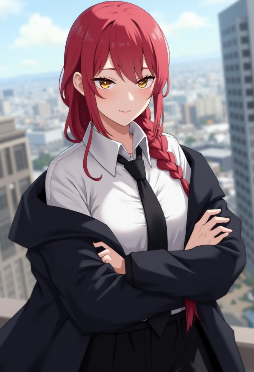 Only trigger word should be Makima. Descriptions like "red hair", "yellow eyes" and "black suit" can improve the quality and shoud be used in v1 and v1.1