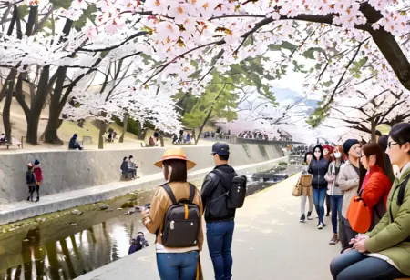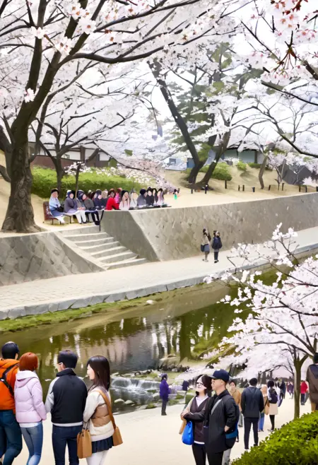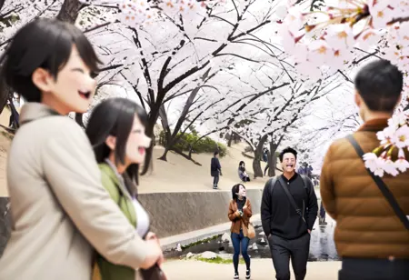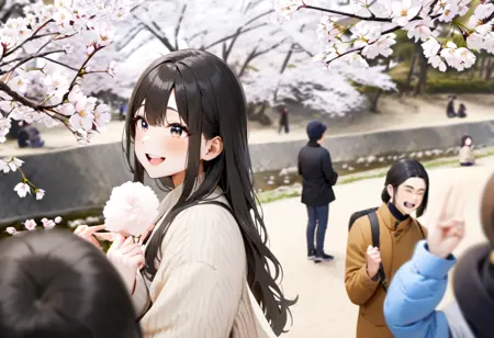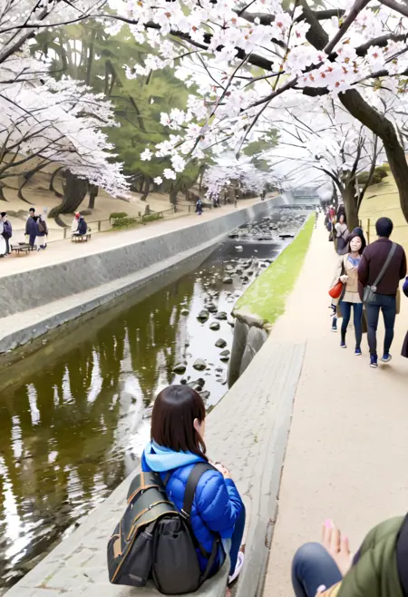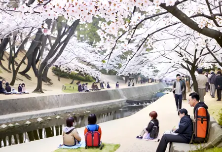 syukugawa, tree, outdoors, scenery, real world location, multiple boys, cherry blossoms, multiple girls, bag, 6+boys, grass, park, bench, river, photo background