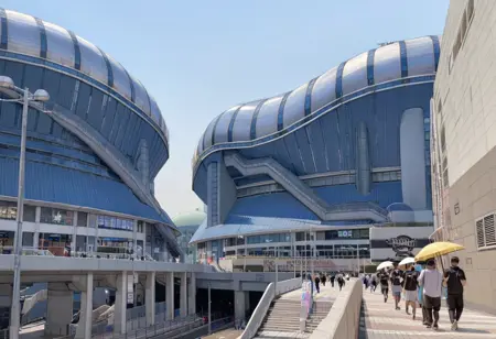 kyoceradomeosaka, storefront, scenery, outdoors, building, lamppost, multiple boys, real world location, sky, street, city, day, tree, blue sky, 6+boys, multiple girls, cityscape, people, walking