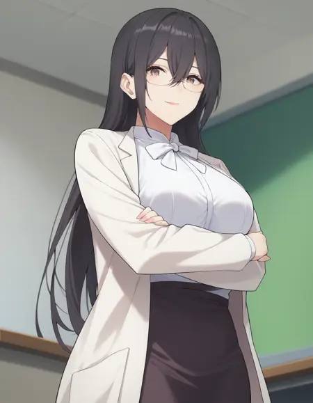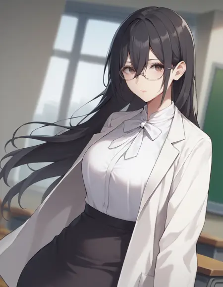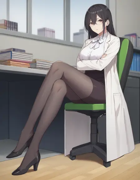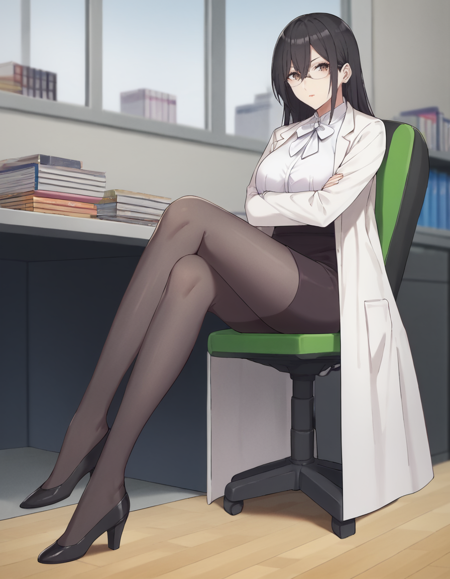white coat, white bow, white shirt, black pencil skirt, black pantyhose, black high heels