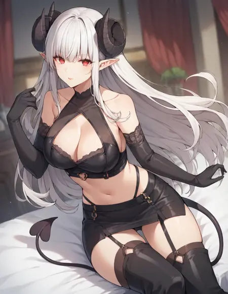 lustalotte, long hair, white hair, sidelocks, curled horns, red eyes, colored eyelashes, pointy ears