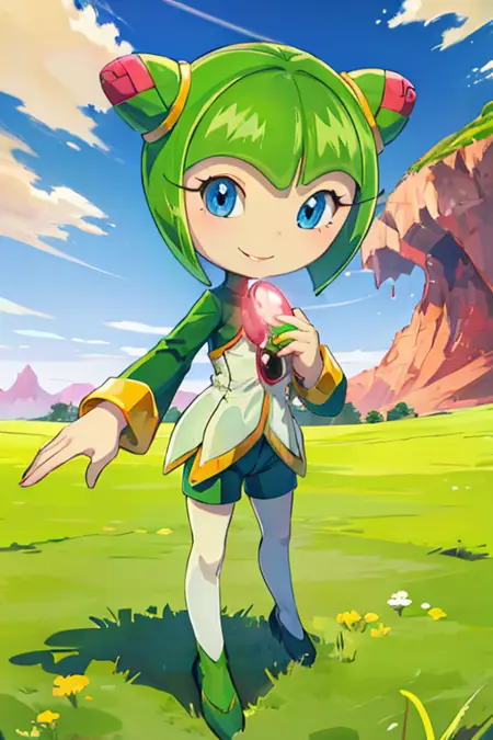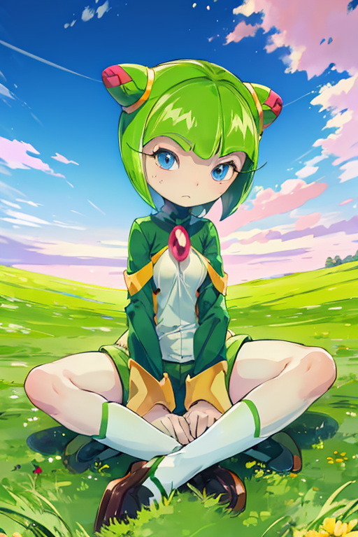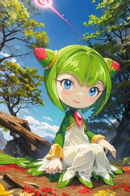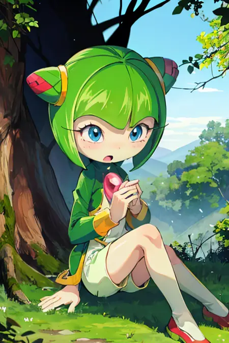 使用 1girl, sthcosmo, seedrian 召唤她(省略 1girl 可获得更准确的原画设计),使用 蓝色眼睛,圆锥发髻,绿色头发,短发 构建她的头部,使用 绿色连衣裙,红色宝石 召唤她默认的服饰。