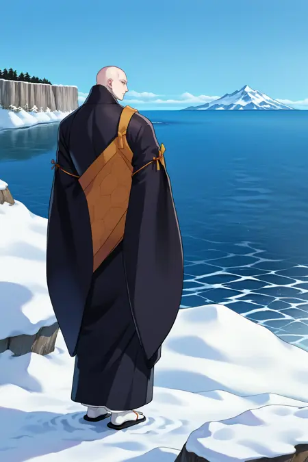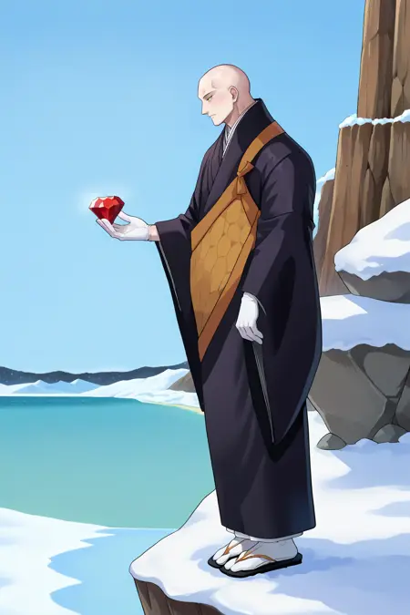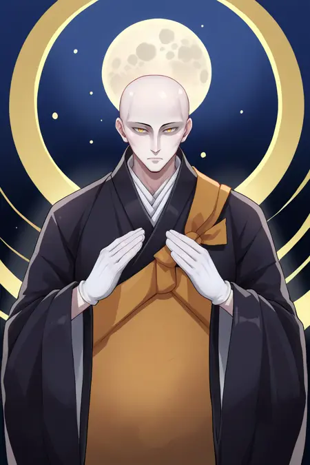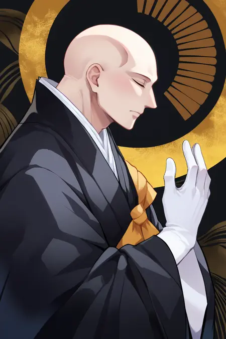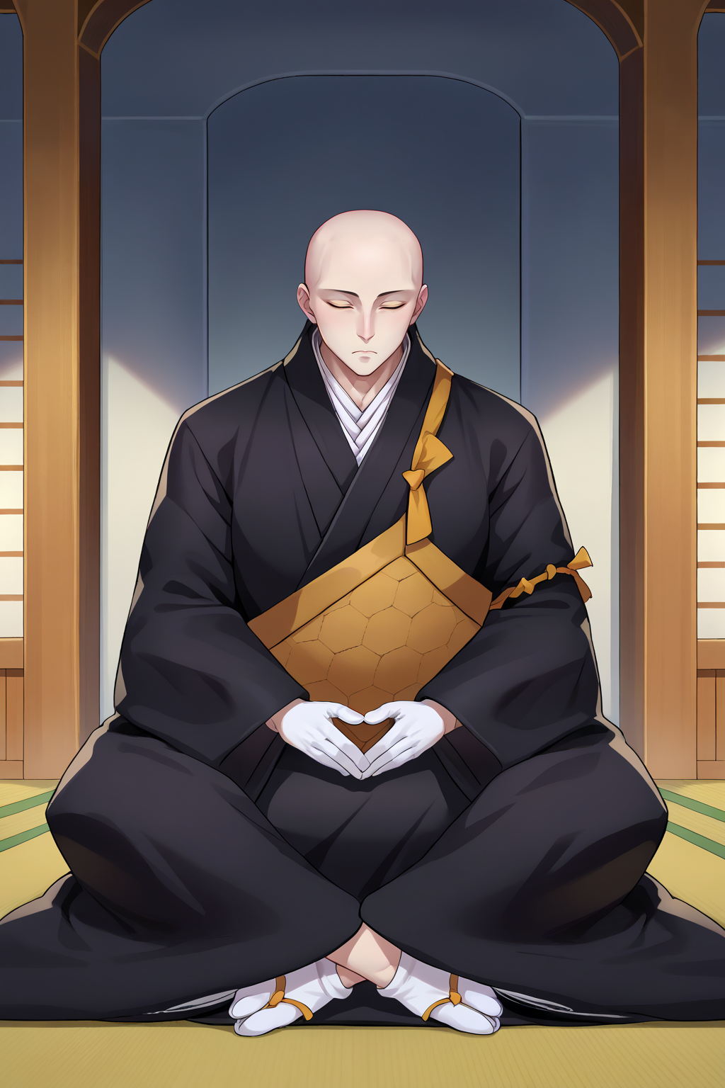 복장: 검은 키모노, 케사, 흰 장갑, 타비