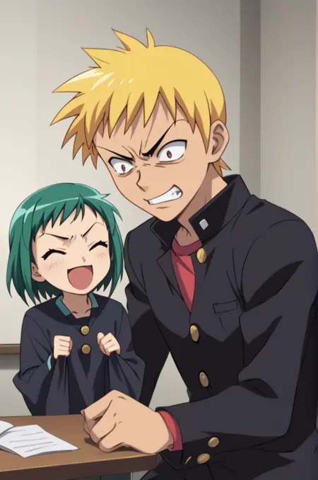 그리고 다음과 같은 프롬프트를 입력하라: 귀여운 커플, 여자, 미도리, 짧은 녹색 머리, 녹색 눈, 'I LOVE SEIJI'라고 쓰인 흰색 드레스 입음, 행복한 표정, 뒤에 남자, 세이지, 금발의 곱슬머리, 어두운 눈, 검은 학교Uniform, 빨간 티셔츠, 금색 단추, 상반신, 단순한 배경, 액션 포즈, 손마루 인형