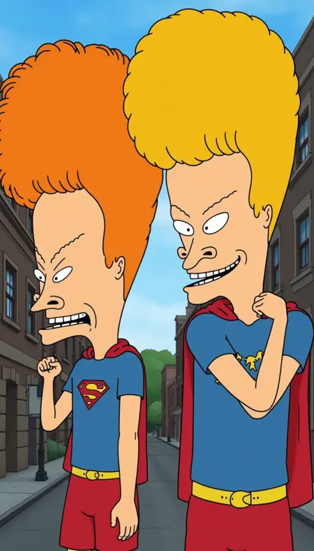 嘿,90年代打来电话,叫你把衬衫从头上套下去,再拿点卫生纸给你的屁股洞——Beavis 和 Butthead Lora,带我们重返记忆之旅,结合 Flux 对提示词的趣味理解,使用17张图片训练,AI-toolkit,默认参数