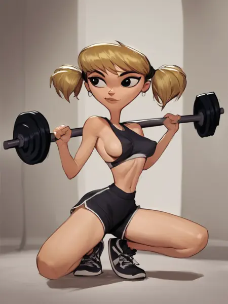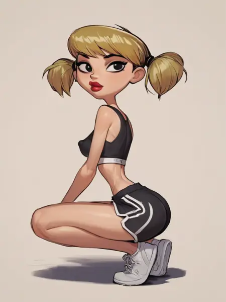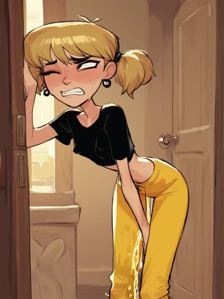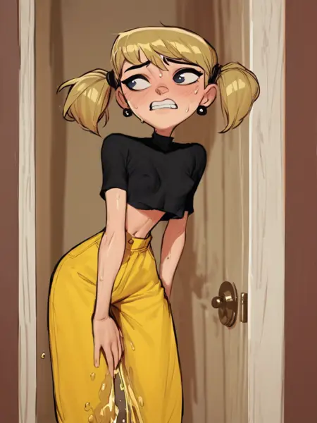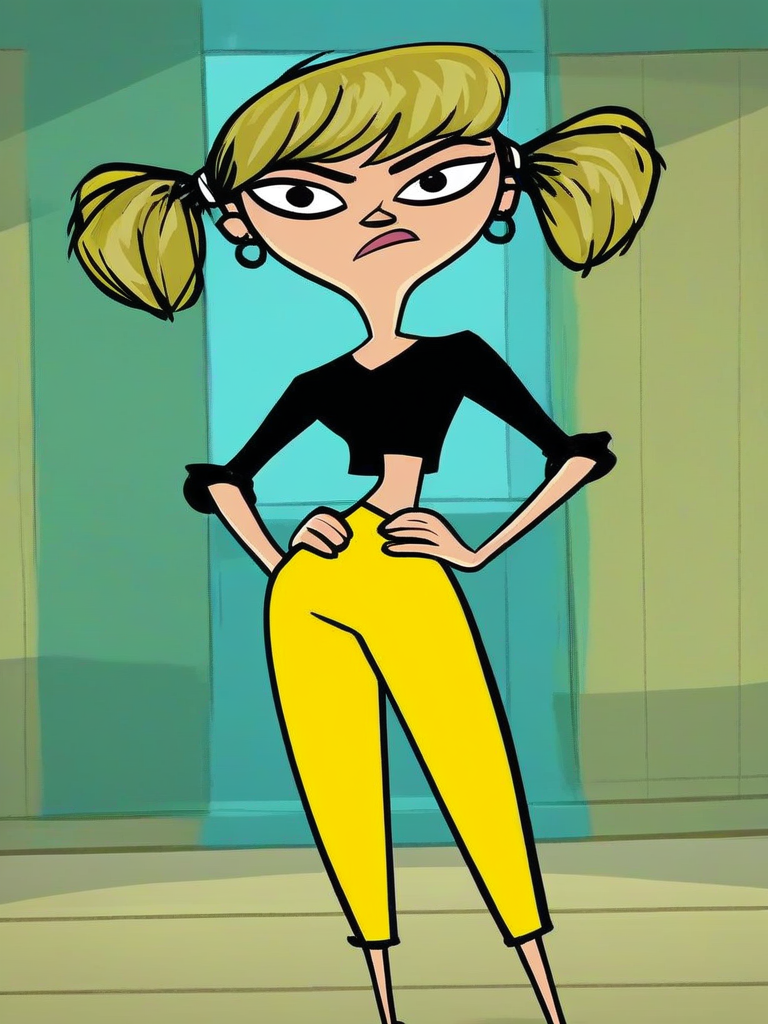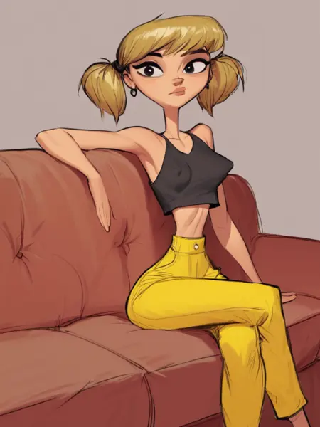 blonde hair, crop top, black shirt, yellow pants, short twintails, earrings