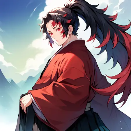 人类形态:1boy,空洞眼神,红色眼睛,长发,黑发,红发,马尾辫,双色头发,额头疤痕,红色和服,黑色袴,袴裤,宽袖,耳环