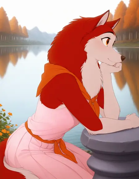 提示词: Jenna, amber eyes, fluffy neck, orange neckerchief, red fur.
