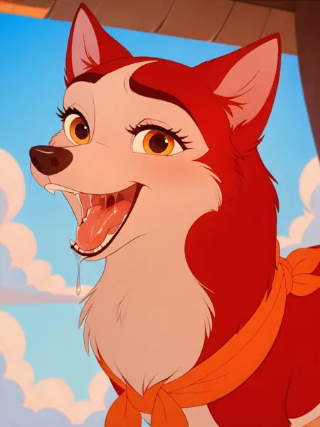 A purebred husky with red and white fur (which she passes on to Kodi and most of her puppies), dark red on her ears, back, upper legs, and upper tail, and white on her face, chest, and underparts. She has small black markings on the tips of her ears and amber eyes. She usually wears a red and orange bandana around her neck. From a dog's perspective, she is considered beautiful and apparently very desirable, as evidenced by the immediate attraction of Balto, Steele, and the passing dog at the beginning of the featured film.