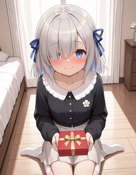 公衆衣装: mgrcisuzuren, renpbc, 青い髪のリボン, (黒いカーディガン:0.5), 白いピューリタンカラー, 花のピン, 白いチェックスカート