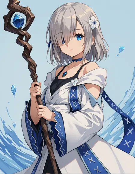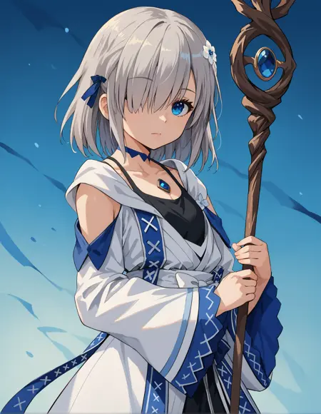 魔法服装: mgrcisuzuren, renmgc, 头发上的花饰, 蓝色发夹, 黑色无袖上衣, 蓝色项圈, 蓝色胸饰, 白色和服, 宽袖, 肩部露空, 带蝴蝶结的白色腰带, 蓝色腰间蝴蝶结, 单只黑色过膝袜