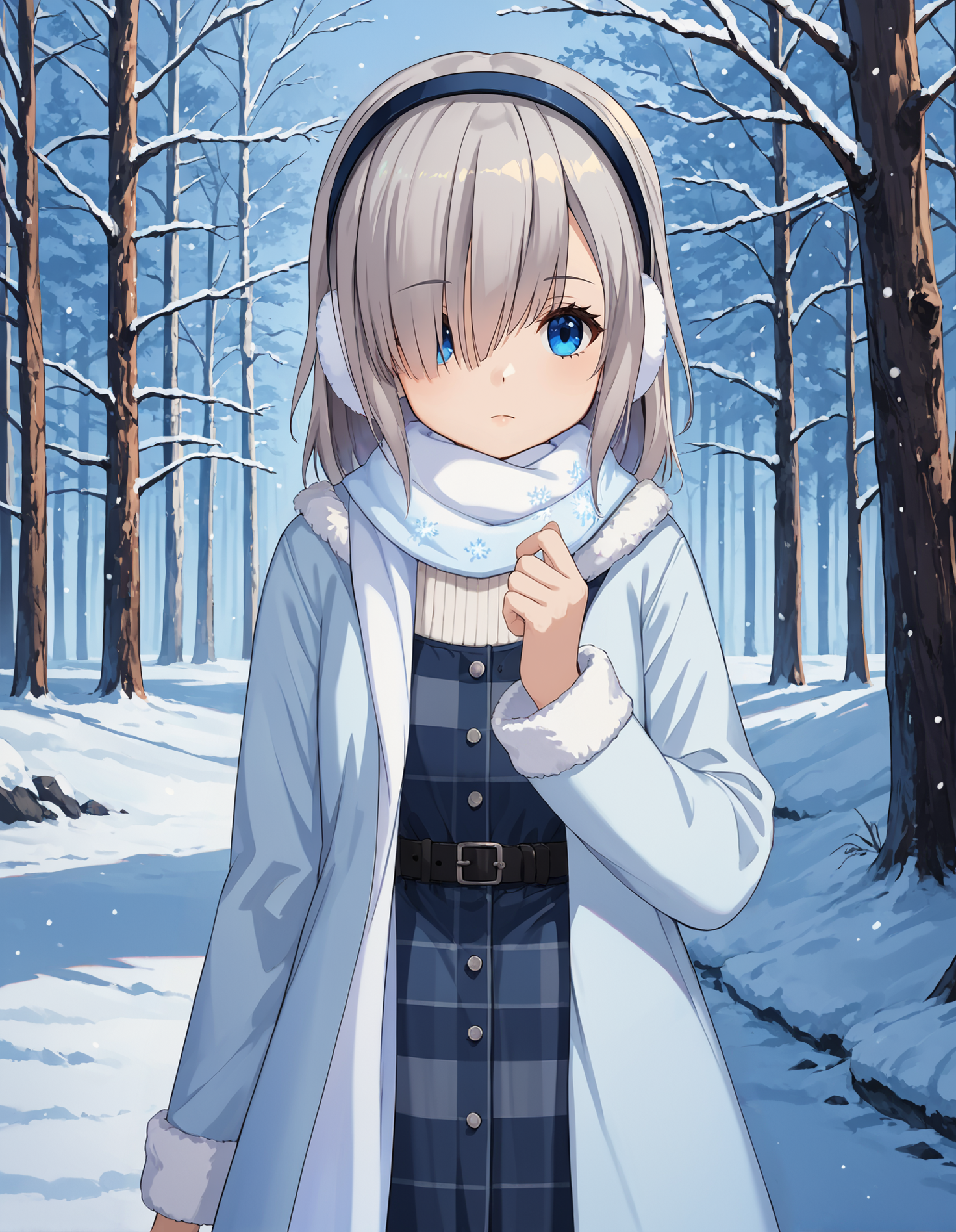 冬季服装: mgrcisuzuren, renwtr, 白色耳罩, 白色围巾, 白色毛衣, 蓝色背带裙, [黑色皮带], 开襟蓝色冬外套, 黑色连裤袜