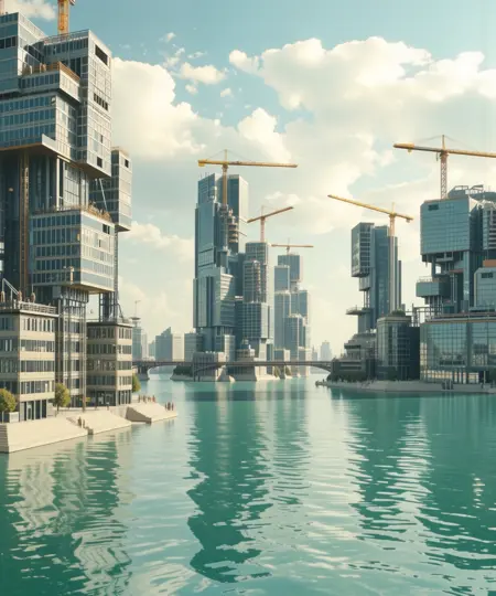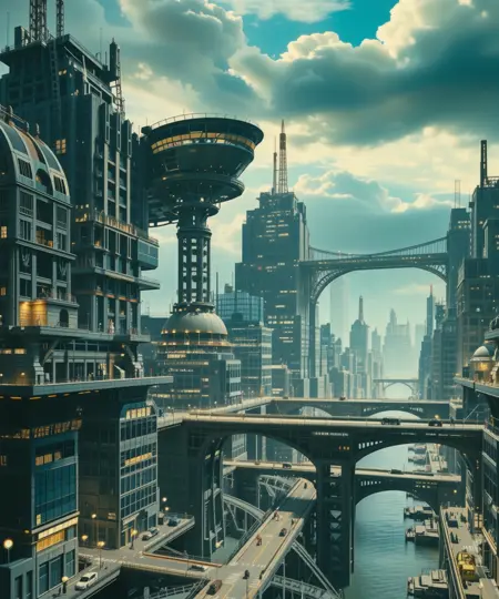 → 細部まで複雑な円筒形・円形構造を持つ多層都市景観