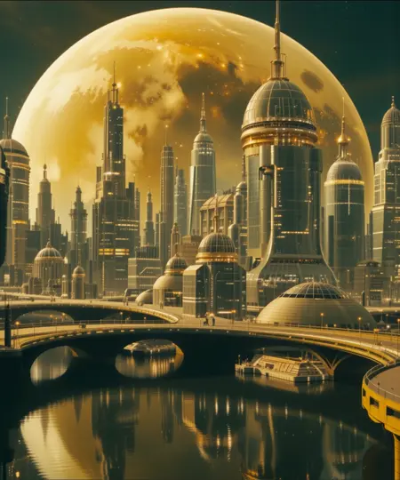 → オレンジ色のリングを持つ惑星を背景にした未来都市