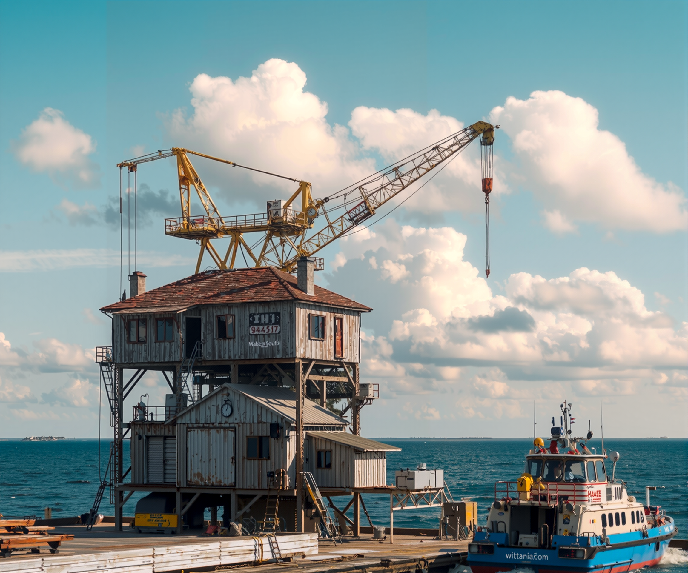 → Industrial floating platform above water with multiple levels and cranes