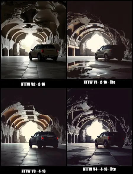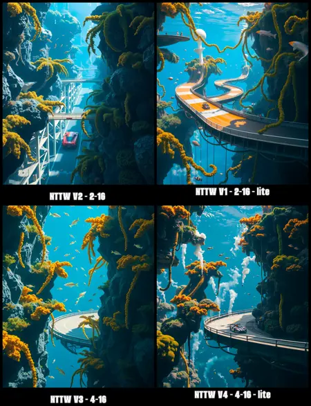 This generative image model appears to be specialized in creating detailed architectural fantasies, futuristic cityscapes, and industrial structures. The "nttw style" modifier combined with specific style categories and variation numbers provides a structured system for generating consistent yet varied architectural imagery.