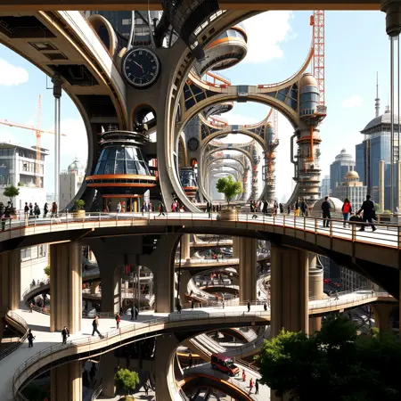 Bridges & Connections: Elevated walkways, arches, and bridges connecting structures