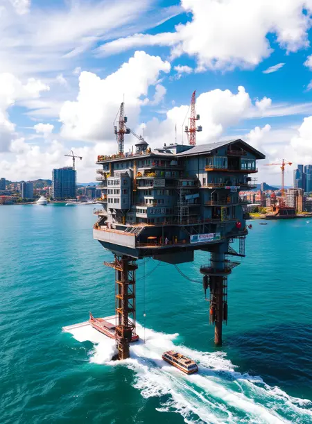 → Industrial floating platform above water with multiple levels and cranes