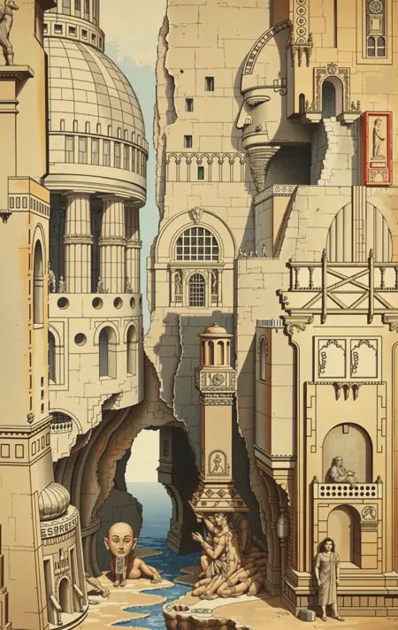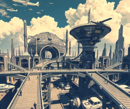 → 多层次城市景观,包含复杂的圆形与圆柱形结构