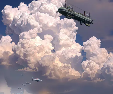 漂浮/悬空结构:多数风格都包含悬浮于地面或水面之上的建筑、城市或平台