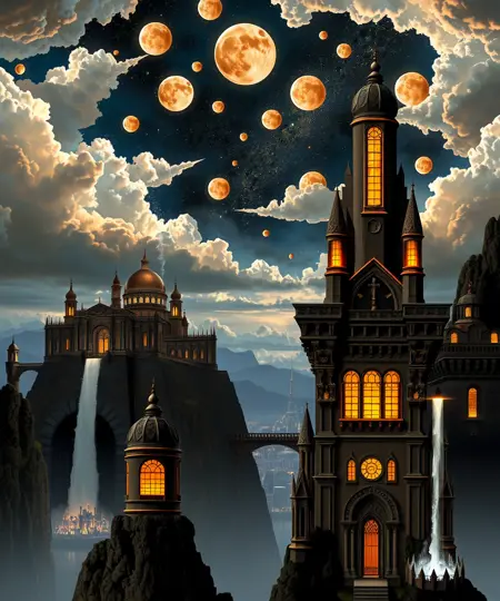 → 구름 위에 떠 있는 고딕풍 초현실적 도시, 거울 같은 반사