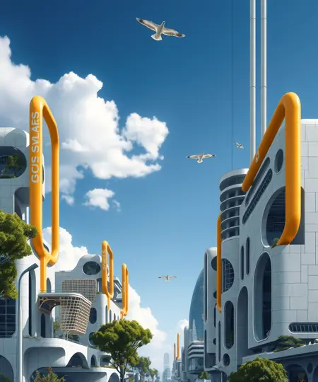 → 주황색 링이 있는 행성 배경의 미래 도시 경관
