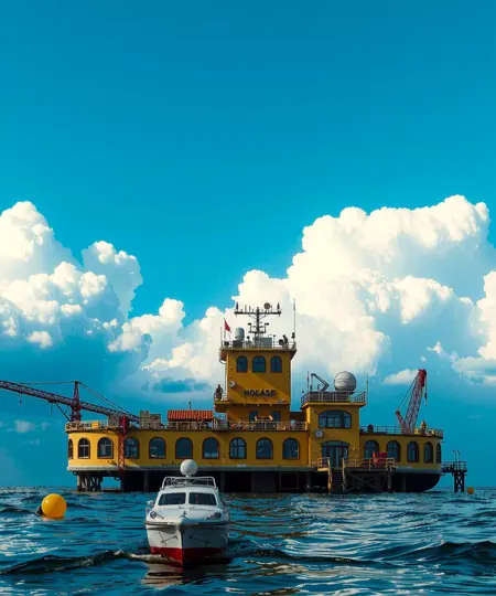 → 水面上方的多层工业漂浮平台,配有起重机