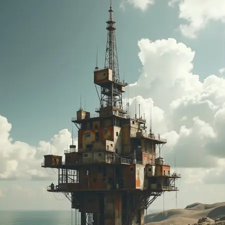 → 水面上方的多层工业漂浮平台,配有起重机