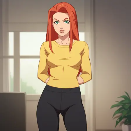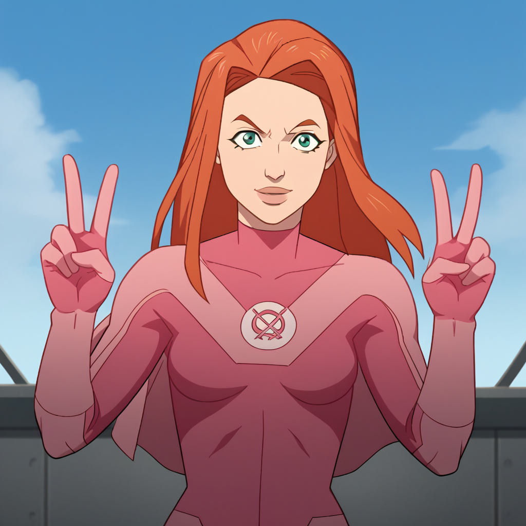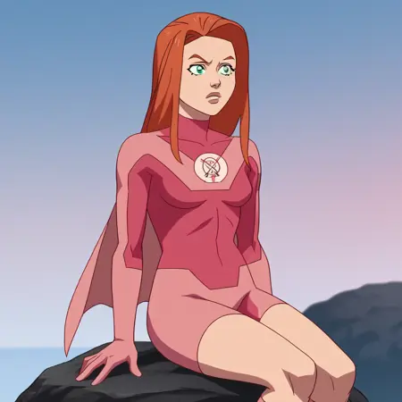 atomeve, 1girl, solo, red hair, long hair, green eyes, bodysuit, pink bodysuit,