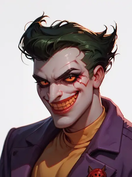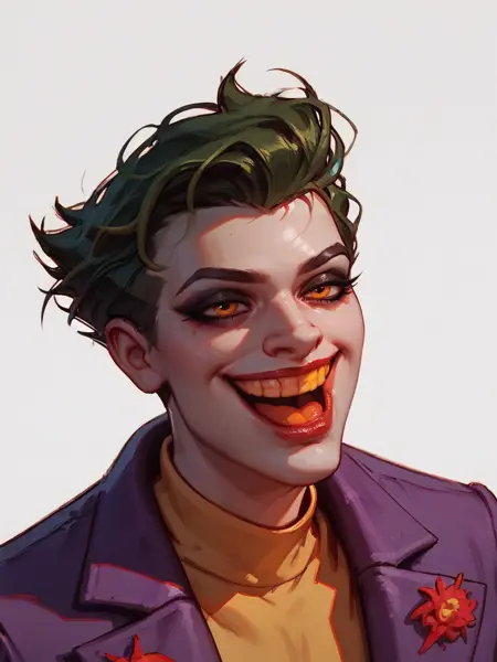 良いプロンプト例: TheJoker, 黒いアイシャドウ, 悪魔的な笑み, (緑の髪)