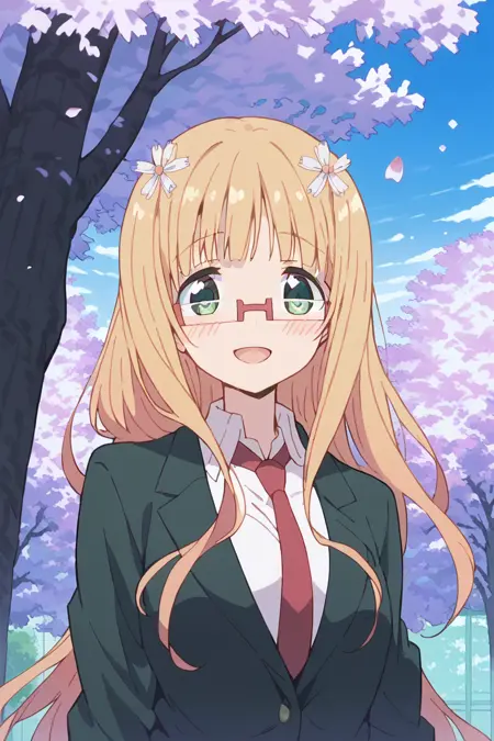 mitsuki, 1girl, glasses, long hair, hair ornament, solo, blonde hair, green eyes, necktie, school uniform, blazer/shirt