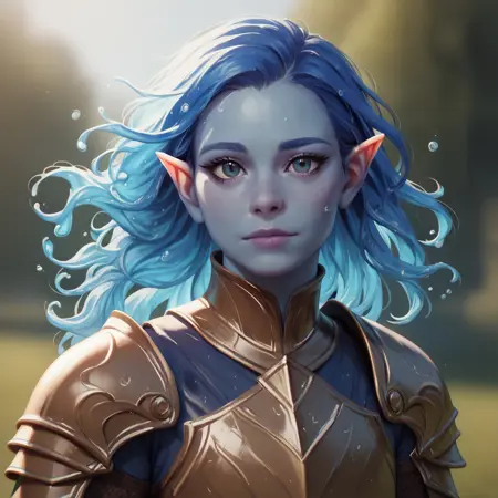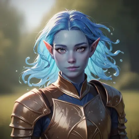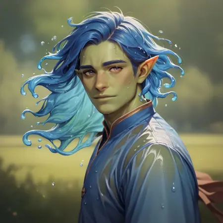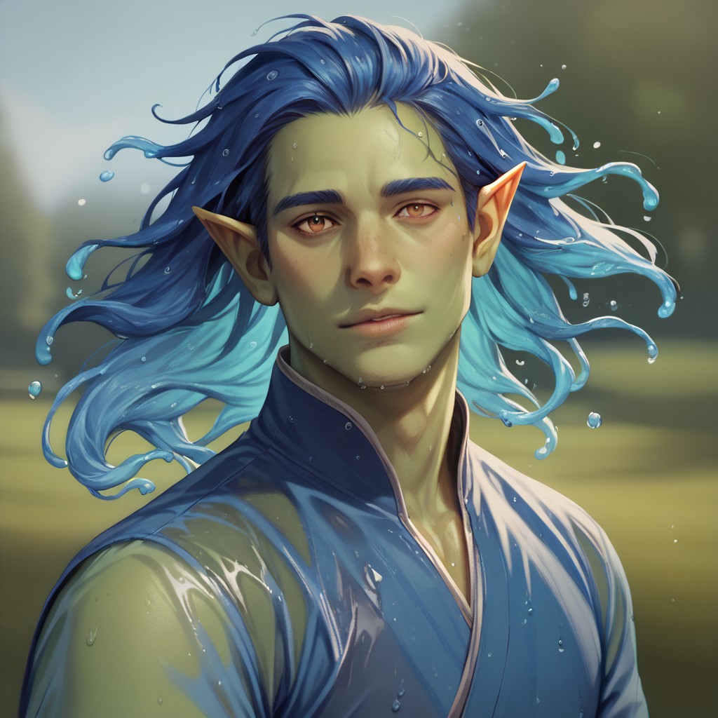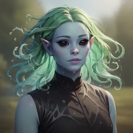 例のプロンプト: watergenasi、尖った耳、浮く髪、液体の髪、濡れた服、濡れた体、大きな黒い目、1male、緑の肌、青い髪
