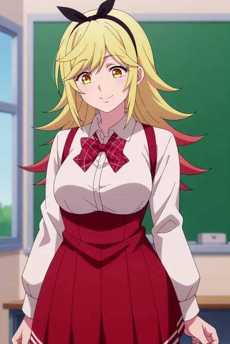 服装:白色和红色V领衬衫,红色内衣/涂有条纹的指甲,黑色发带,白色长袖衬衫,红色领结,红色裙子配白色条纹