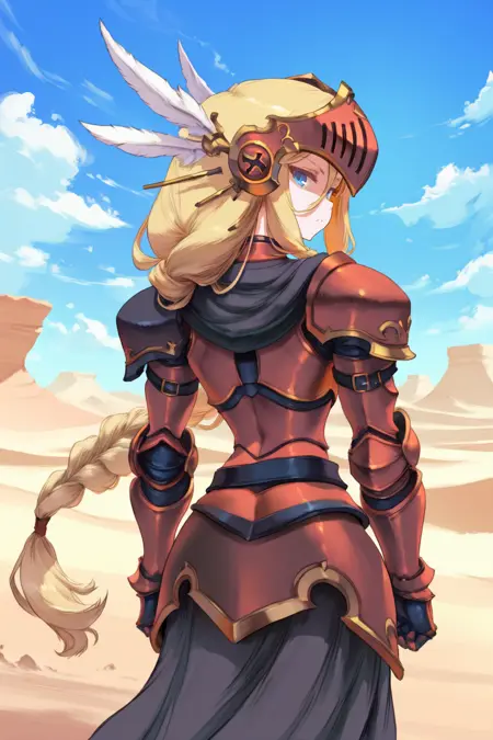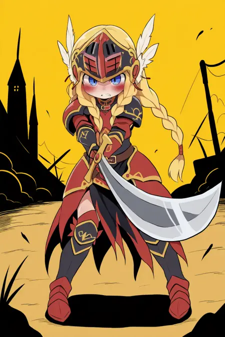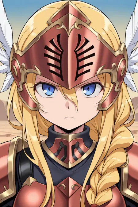 유용한 태그: 1girl, 금발, 긴 머리, 땋은 머리, 파란 눈, 발키리, 시저(갑옷), 날개 달린 헬멧, 갑옷 드레스, 갑옷, 장갑, 부츠,