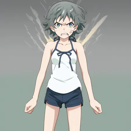 oikura sodachi,1girl,smile,flipped hair,olive hair,green eyes,camisole,blue ribbon,blue short pants,