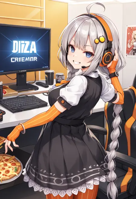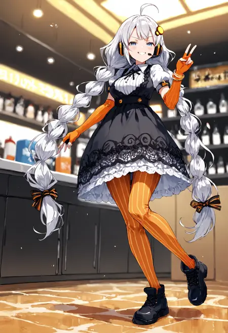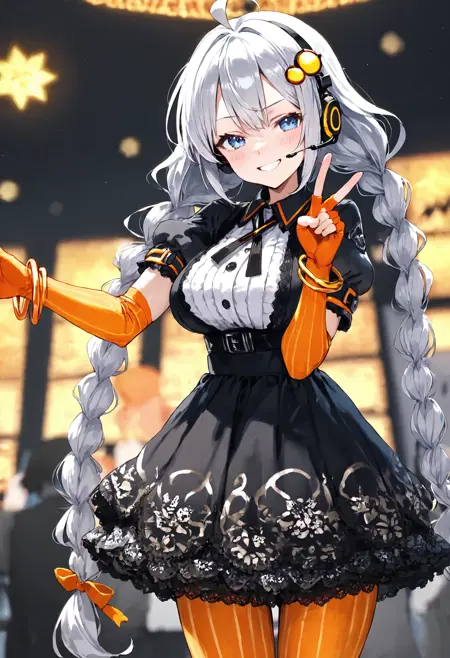 <lora:KizunaAkari_MMD_Pony_V1:0.9>blue eyes, grey hair, ahoge, twin braids, braid, very long hair, hair ornament, hair tubes, headphones, headset,